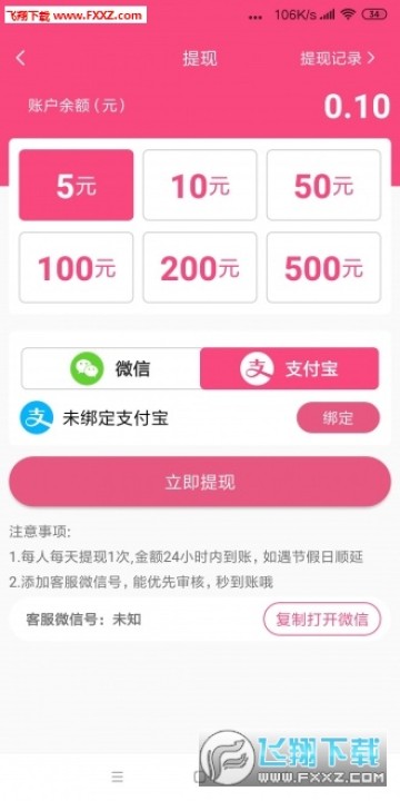 2、每人每天提现1次,金额24小时内到账,节假日顺延