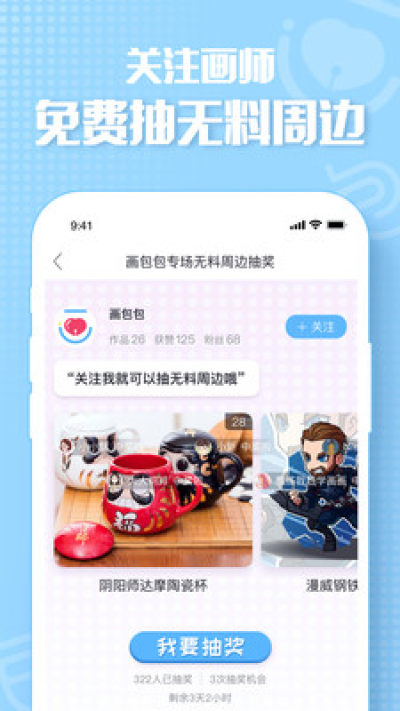 画包包app是一个以二次元文创为特色的社区平台,不仅汇聚了海量的同人绘画作品,而且还有很多的漫画周边哦,关注你喜欢的画师,还可以抽无料周边,享很多的特权,喜欢二次元的小伙伴们,千万不要错过画包包app。