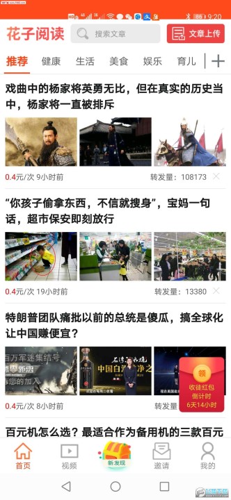 花子阅读app是一个实力平台旗下新出的平台,分享文章就可以轻松赚钱,目前新上线还属于推广期,新人注册有现金奖励,而且还有福利活动哦,根据收益会赠送额外现金,首次满5元就可以免审核提现,赶快下载花子阅读app体验吧。