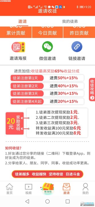 收徒奖20元,前3次:1/2/3元,转发满100奖6元,满200奖8元,新上线推广期间徒弟徒孙进贡高达65%