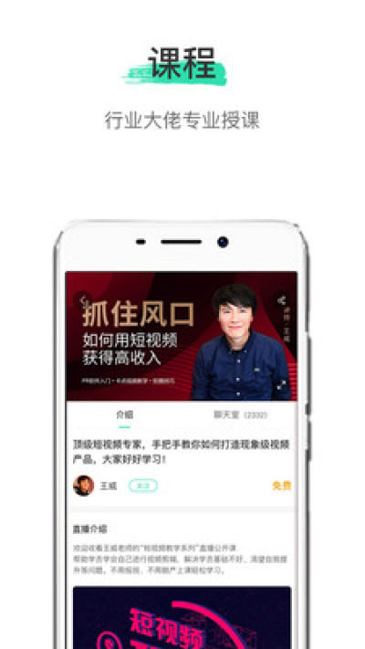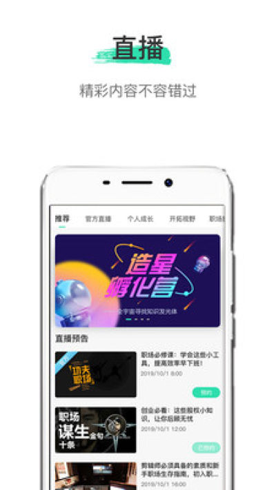 用户可以分享知识、经验、技能来展现另一个闪光点,同时也可以利用自身的碎片化时间,根据自己的兴趣点及个人提升需求,寻找相对应的知识小视频以及观看在线直播讲堂的方式填充行业知识、丰富经验技能。