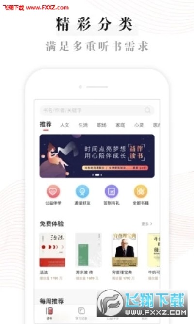 益伴涵盖了人文、生活、职场、家庭、心灵等多种类型的书籍,满足不同性别不同年龄段用户的听书需求。