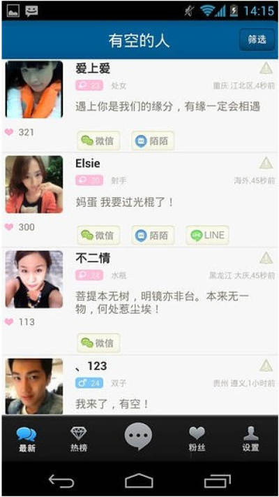 1.查看有空聊天的人,支持按性别、年龄、地区、星座筛选2.直接复制对方微信号(陌陌号、LINE ID),方便在聊天工具里搜索添加3.赞一下求聊天4.更新状态,在你有空的时候告诉大家,让大家来找你聊天5.举报虚假及非法、侵权信息
