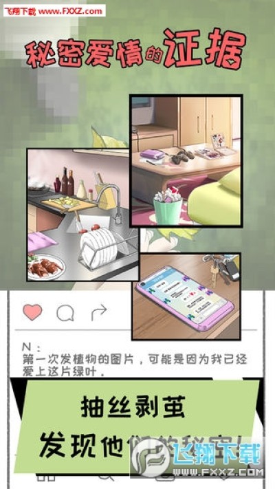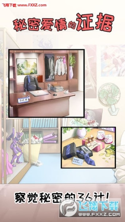 《秘密爱情的证据文字剧情》是一款休闲类的游戏,游戏中玩家需要找到的隐藏的第三者,从场景的各个线索和道具中,发现秘密的爱情,卡通的画面风格,简单的控制操作,解开故事的真相,更多精彩赶快下载体验吧!