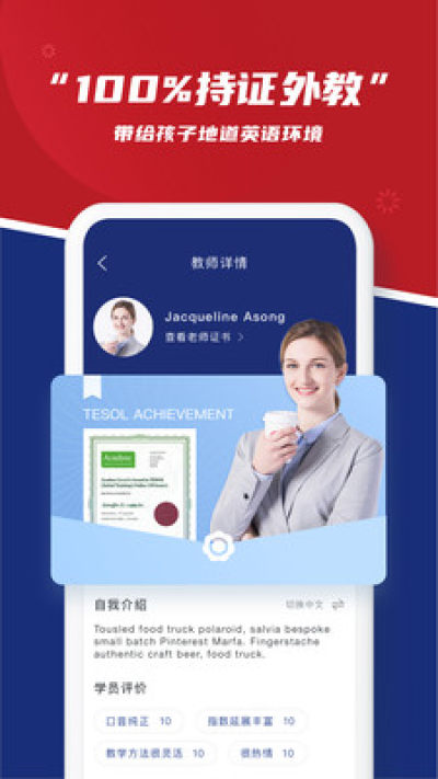 严选10000+少儿外教,100%持有TESOL国际专业英语教育资格证书,一对一实时互动教学,爱孩子懂孩子,带给孩子地道的英语环境。