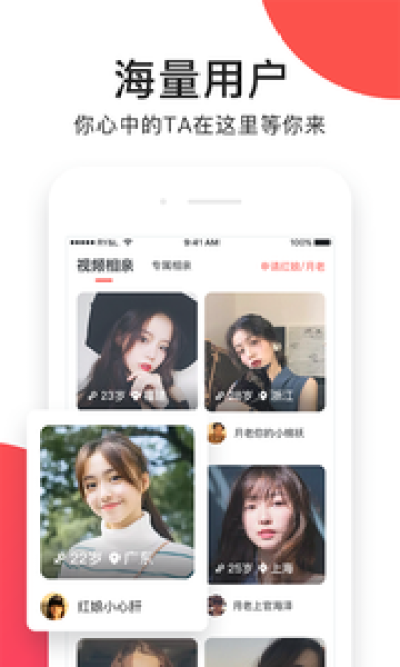 视你app是一款手机在线视频相亲类的软件,在这里用户可以找到心仪之人,支持视频、语音模式的相亲,在视你app上还有专业的红娘牵线,防止你们尴尬,也能提供同城的位置交友,还能约线下哦!
