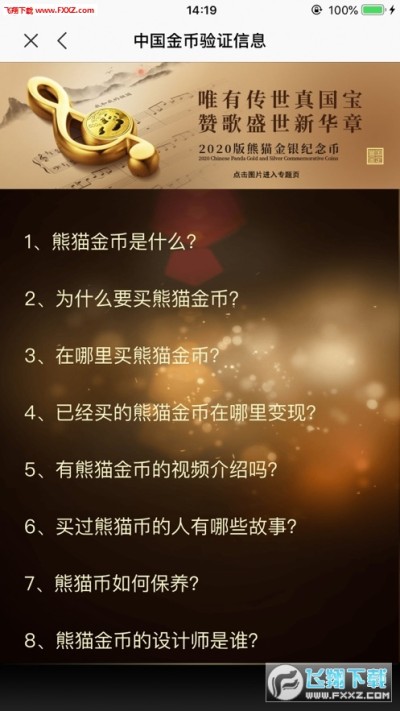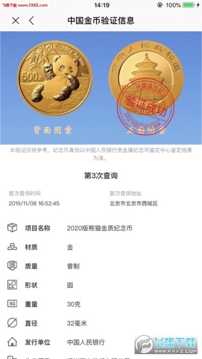 中国金币验证app是由中国金币网官方推出的一款权威的手机金币真伪验证平台,这款软件主要是针对中国金币网官网发行的各种纪念性金币,在手机中国金币验证平台可以直接扫描二维码查看真伪信息!