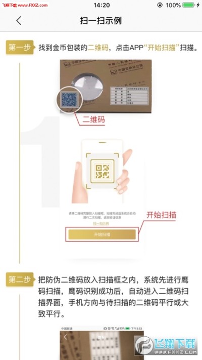 找到金币包装的二维码,点击APP“开始扫描”扫描。