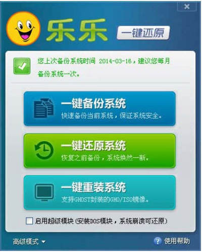 乐乐一键备份还原系统:不用安装即可使用,绿色安全,兼容性强,功能完善。可在Win32(64)、winpe、DOS 下对任意分区进行一键备份与还原,支持ISO文件、光盘、U盘里的GHO文件硬盘安装;支持设定密码保护、自定义热键等功能。