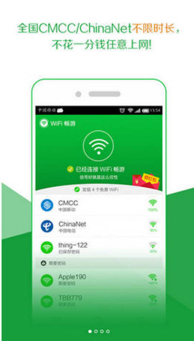 Wifi畅游于中国电信(ChinaNet)和中国移动(CMCC)进行合作,将Wifi热点免费分享给用户。同时, 用户分享了公共区域的Wifi密码,使广大网民免费上网。我们不会暴力破解加密网络,充分发挥互联网分享精神。 WiFi畅游从V2.0版本起,不限时长,不用U币免费上网,CMCC(移动)和ChinaNet(电信)免费连接。