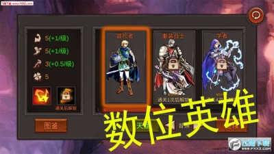3、数位英雄,有冒险者,重装战士、学者这四种,冒险者开局就送,重装战士通关一次即可解锁,学者通关4次即可解锁。