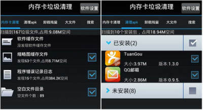 4、支持扫描内存卡的apk安装包,按照“已安装”和“未安装”智能分类并支持选择性删除apk安装包;