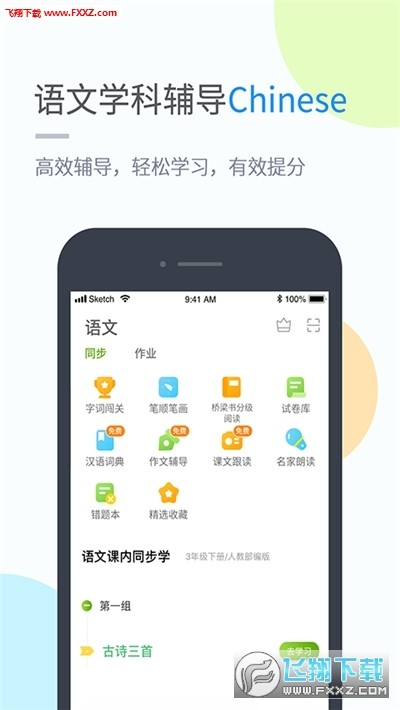 字词闯关、作文宝典、课内同步学、老师作业、课文跟读、名家朗读