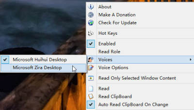 安装完毕运行后 Screen Reader 会自己安安静静的呆在托盘里,你可以通过呼出它的菜单来实现朗读人声的切换。