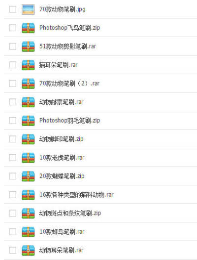 集合中包含了猫狗耳朵、鸟类、兽类、动物邮票、羽毛、蝴蝶、老虎、动物足迹、以及各种动物笔刷等。
