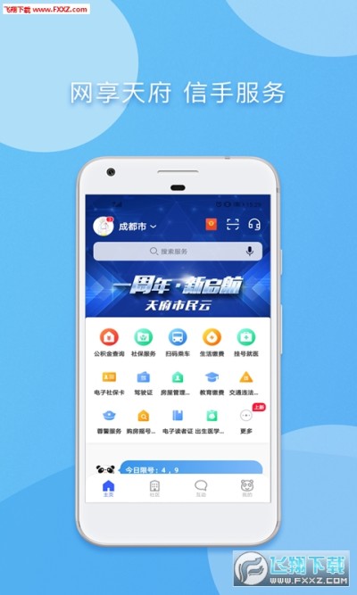 天府市民云app是一站式“互联网+”市民服务平台。用户凭借一个账号就可以一号通行,一号通办,轻松享有各类服务。天府市民云,汇聚城市服务、提升服务质量,为用户提供婴幼服务、文体教育、民生保障、就业创业、家庭生活、交通旅游、健康医疗、环境气象等全方位服务。一个超级App,贯穿用户“衣食住行、生老病死、安居乐业“等全生命周期服务。从蓉生活,自在云端!