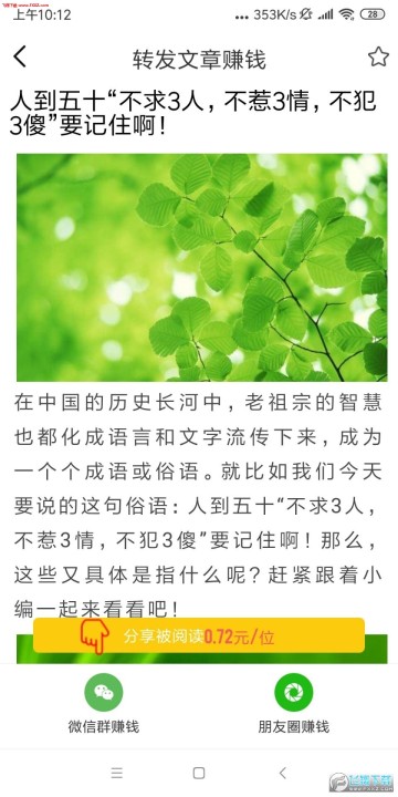 答:把文章或视频分享到朋友圈,只要您的好友阅读过文章或视频,您就有收益。收徒是赚钱最快的方法,建议每天早中晚各自分享几篇!单价0.72元