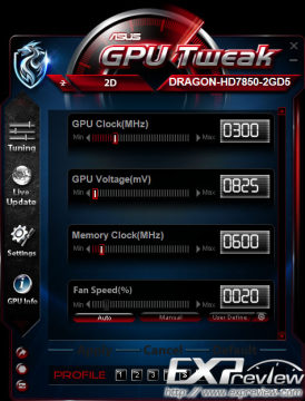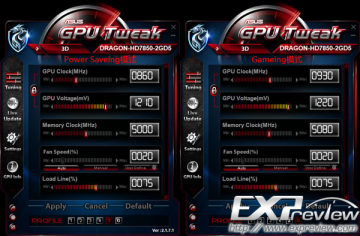 以这款HD 7850龙骑士为例,默认状态下核心/显存频率分别为910/5000MHz,核心电压1.210V。在Power Saveing模式下GPU频率会降至860MHz,而Gaming模式GPU频率会升至930MHz显存也会升至5080MHz,核心电压1.220V。
