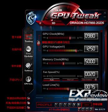 GPU Tweak的主界面介绍请看上图,现在已经切换至高级模式,界面上增加GPU电压和负载设置两个选项,窗口左侧是工具栏,左下角三个小圆形键则分别是“快速启动指定测试程序”(需要再软件设置里设置程序路径)、“标准与高级模式切换”和“开启实时监控窗口”键,下方是6个Profile存储档位,Save键只会在用户设置好显卡的频率并应用后才会出现。