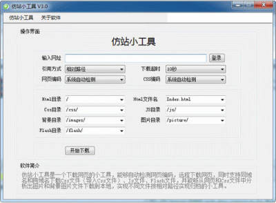 仿站小工具是一款功能非常强大的仿站软件,能通过网址下载静态网页。这款软件占用空间小,只需输入要模仿的地址,即可模仿出一个与模仿的地址非常相似的一个网站,并能分析目标站点的图片下载地址自动下载到本地。