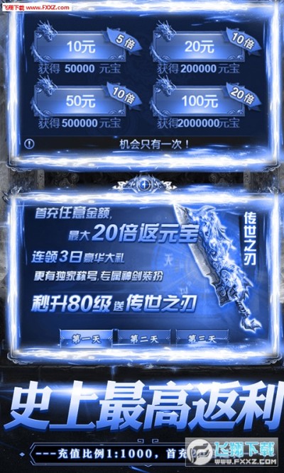 2、史上最高返利:充值比例1:1000、首充20倍返利,次充1:2000