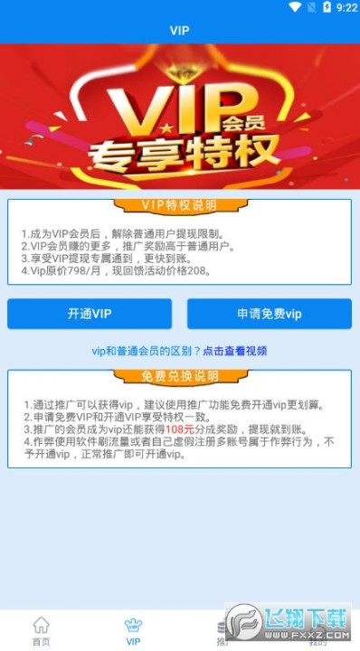 1、建议通过推广免费开通Vip,推广还可获得丰厚现金奖励,邀请用户注册,奖励现金4元/位,如果邀请的用户成为Vip,奖励108元/位。