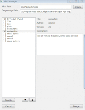 2.选择MOD文件夹,点击“merge(合并)”按钮,第一次安装MOD会弹出一个窗口,问你package.mft的保存位置,请在Dragon Age Inquisition\Update里选择(例如:C:\Program File\Origin\Origin Games\Dragon Age Inquisition\Update\Mods)