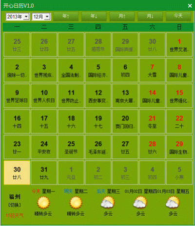 开心日历是一款非常简单小巧而且功能实用电脑日历工具,其绿色安全体积小,提供日历查询以及最近七天的天气预报,并支持新历与农历,。