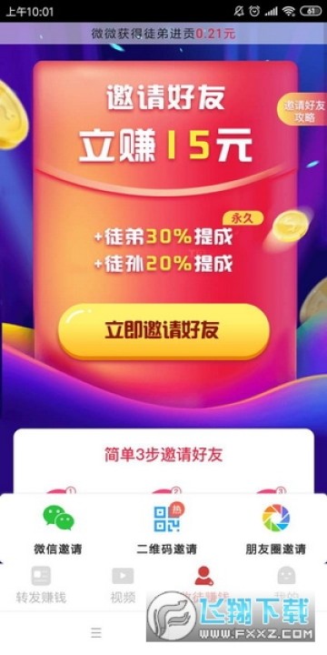 邀请好友立赚15元,永久获得徒弟30%提成+徒孙20%提成。