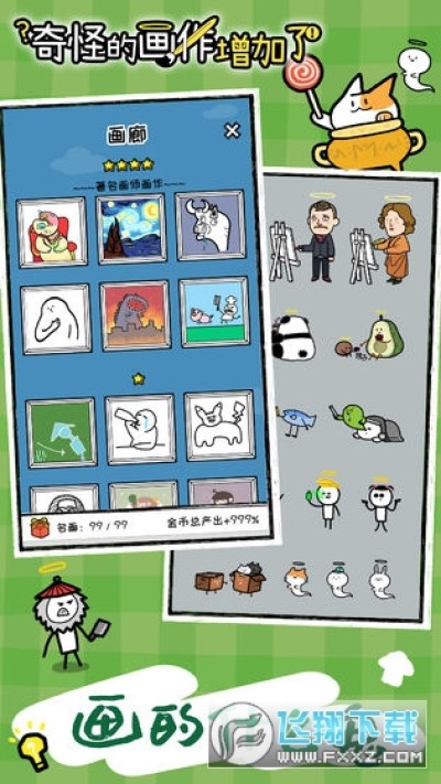 奇怪的画作增加了安卓版是一款卡通风格的佛系挂机手游游戏里玩家可以解锁世界上各种著名画家,让他们回来继续完成各种奇怪的画作,只需要放置即可不断的积累金钱,轻松的解锁更多的游戏内容,喜欢的小伙伴不要错过!.