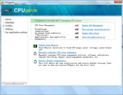 打开界面左侧profiles,看到这个界面实际上和RMCLOCK如出一辙,用过RMCLOCK的基本上就会使用了,选择在电池模式下ONb attery或者交流电 On Ac Power情况下,需要控制的模式一共5种可定义模式1. No mangement 2.Extreme Power Saver 3.Blanced 4.Exrtreme High Performance 5.Custom。实际上每一种模式都要自行设置,而CPUgenie只能选择一种模式来运行,当然电池状态下和交流电状态下可以选择不同的模式运行,我现在选择的是电池情况下不管理,交流电才使用CUSTOM模式来管理