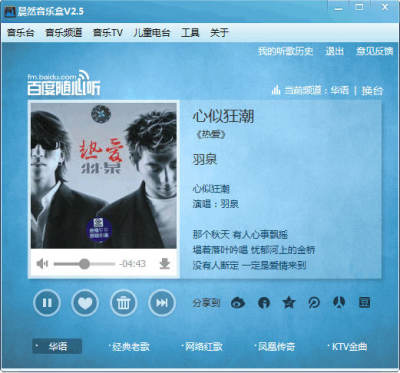 晨然音乐盒是一款非常简单但是功能很强大的音乐播放工具。该软件内置了各种电台,包含多米电台,酷我电台,虾米电台,豆瓣电台,酷狗电台,人人电台,乐库电台等等,让你轻松享受音乐带来的盛宴。