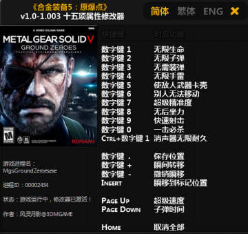 合金装备5原爆点出来已经有一段时间了,版本也一直有更新,以前的一些修改器可能不对应版本而不能使用了,这里给大家分享一个3DM的十五项多版本修改器,包含了1.0-1.003版本,有需要的玩家自行获取。