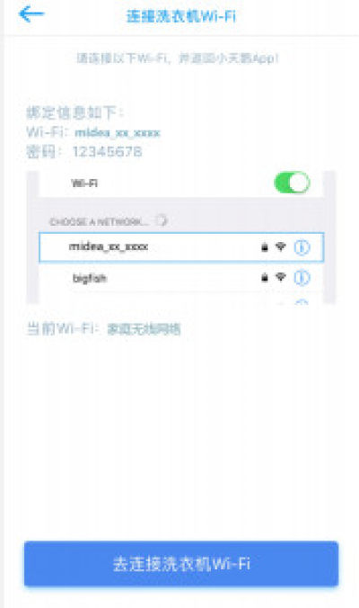 10. 根据界面上的说明,点击“去连接洗衣机Wi-Fi”,手动将手机的无线网络连接到家电的热点Midea_XX_XXXX ,默认密码为12345678,连接成功后返回,会自动开始配网;