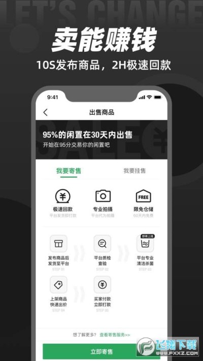 上95分app轻松卖闲置极速回血,无需开店,仅需10秒即可自主上架,平台提供质检,鉴定,洗护,拍摄,仓储一站式服务,售出后2小时极速打款。