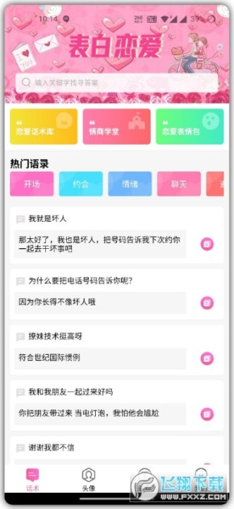 安卓土味情话恋爱话术,现在很多朋友不怎么会说话,也就是情商不高,想要谈朋友比较困难,有了这款安卓土味情话恋爱话术让你轻松搭讪美女,再也不会因为说错话而被拉黑,快来下载试试吧。