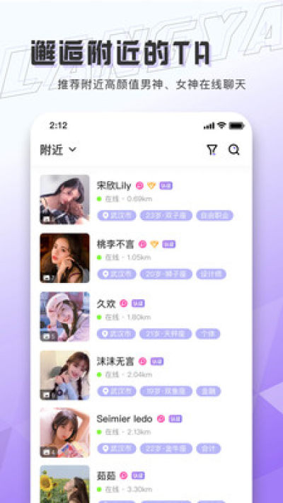 优先给你推荐附近的优质用户,你可以看到对方的实时距离和是否在线;