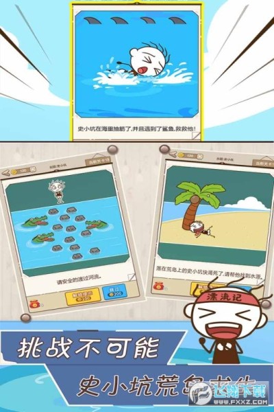 史小坑漂流记为趣味性的解谜游戏,玩家的主要目标是拯救主人公史小坑。 史小坑一开始落难到荒岛上,不断遇到各种倒霉搞笑的事情,每一关史小坑都需要解决一个生存上的难题,缺水断粮、面临危险,遭遇野人,要解决各种问题,才能在岛上生存下去。核心玩法:以问答加操作的形式表现,每个关卡只有一个过关方式。