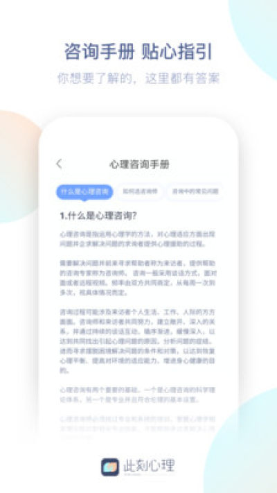 此刻心理app是一款手机心里咨询平台,这款软件为需要心理服务的人群提供服务,在此刻心理app上可以在线预约专业的心理师为你服务,提供多个方面的心理咨询服务,同时安全有保障,保护你的隐私!