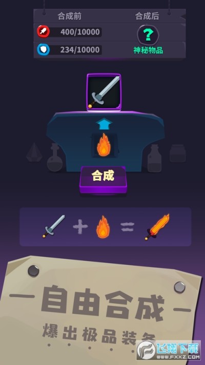 《元素合成》是一款通过合成武器来对付怪物的休闲小游戏,在前进冒险的路上会遇到很多奇怪的怪物,通过战斗将他们击败,还能从他们身上获得掉落的装备,然后把这些装备依次合成为更高级更强大的武器,继续向前探索吧!