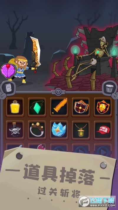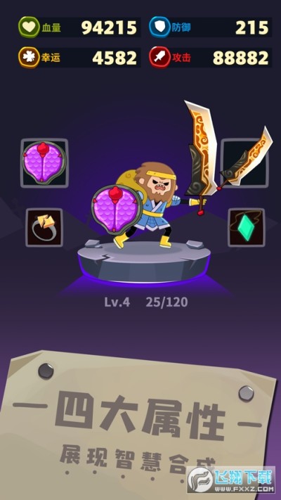 3、有意思的是你可以收集各种奇异的武器和药水,来增强道具的能力,你需要分别提升自己的攻击力、防御力、生命值、幸运值.然后去战胜小妖怪,其中给武器附上冰、火元素,还可以对相克的妖怪产生额外的成倍伤害.游戏超级简单但又考验你的合成小策略.