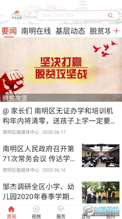客户端集新闻资讯、对外宣传、政务服务为一体,设置有“资讯”、“视频”、“服务”、“互动”、“个人”五大功能模块,汇聚了“南明在线”、“基层动态”、“脱贫攻坚”、“乐活南明”、“大美南明”、“视觉南明”、“朗读南明”等多个子栏目,以新闻资讯发布为切入点,以群众需求为导向,以信息传播为重点,以群众满意为目标,倾力打造为南明区官方权威融媒体“云”平台。