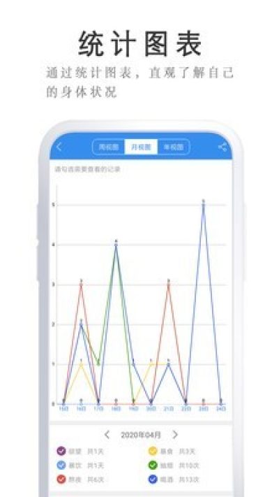 【统计图表】提供周视图,月视图,年视图三种模式的图表,展示每项记录的持戒历程和趋势