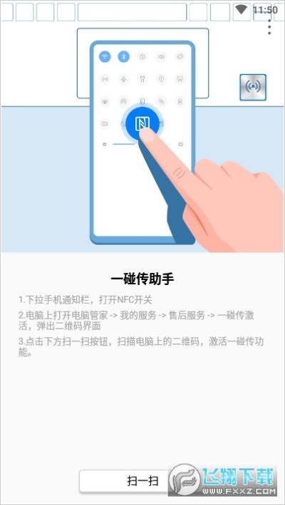 一碰传,连接只需轻轻一碰从手机状态栏向下滑动,调出通知面板,打开 NFC 开关。
