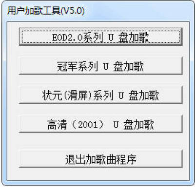 可以给u盘加歌曲的工具,支持eod2.0系列u盘加歌、冠军系列u盘加歌、状元(滑屏)系列u盘加歌、高清(2001)u盘加歌。