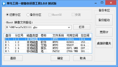 菜鸟工具一键还原备份是一款设计专业、可在Windows下对任意分区进行一键还原恢复、备份的绿色软件。支持最新 Win8.1 系统,操作简便易上手