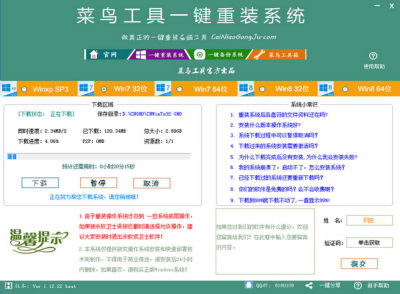 菜鸟工具一键重装系统是一款操作简单的系统重装软件,无需安装,无需U盘,更不需光盘,只需要点几下鼠标, 菜鸟工具一键重装系统将会为您全部完成