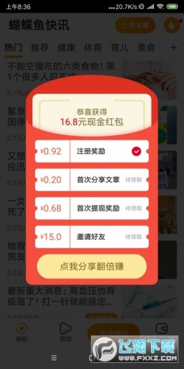 蝴蝶鱼快讯APP是一款转发赚钱的手机软件,下载蝴蝶鱼快讯APP,分享APP上的文章到微信朋友圈即可赚钱,转发单价高达0.7元,涨分快而稳!蝴蝶鱼快讯APP和章鱼快讯、龙虾快讯等都是一家的,支持上传导入文章,蝴蝶鱼快讯APP还提供了热文排行榜,让大家了解转发哪些文章更受好友点击阅读!是一个非常有实力的转发赚钱软件!