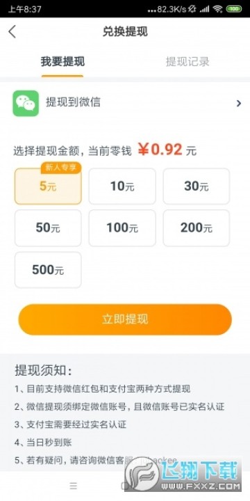 1、目前支持微信红包和支付宝两种方式提现
