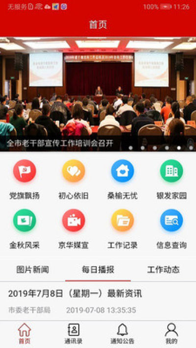 主要提供党旗飘扬、初心依旧、桑榆无忧、银发家园、金秋风采、京华媒宣、图片新闻、每日播报、工作动态及通知公告等功能。